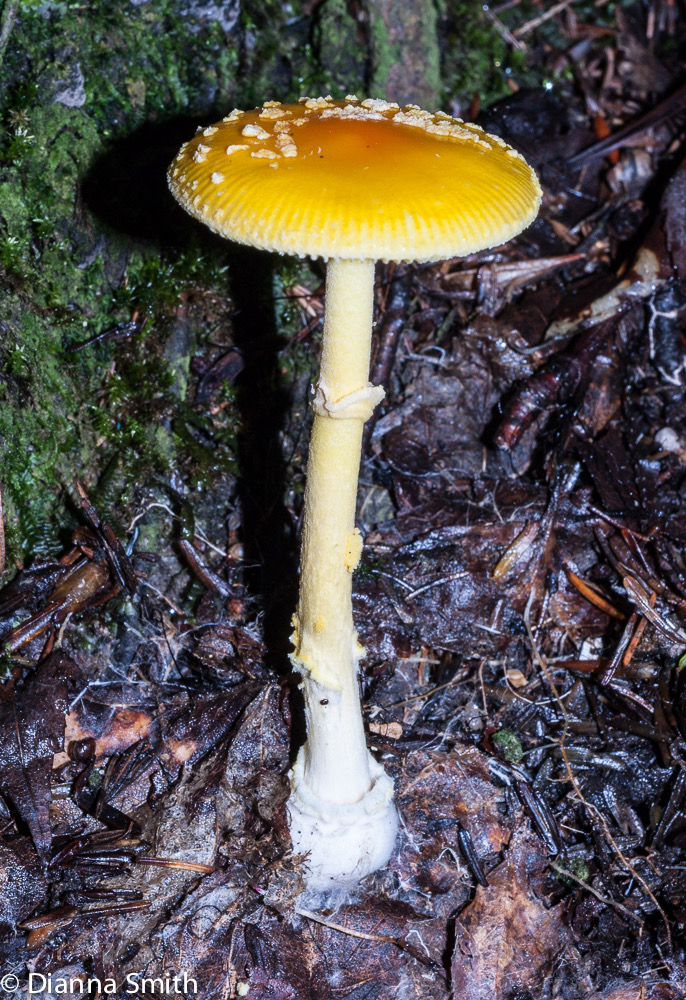 Amanita frostiana resembles Amita flavoconia. Its cap is brilliant orange-yellow with a reddish disc, scattered bright yellow warts from the universal veil. Like Amanita flavoconia, the basal bulb is rimmed. Unlike Amanita flavoconia, the margin of Amanita frostiana’s cap is lined. Both mushrooms can be found in mixed woods, but it is my experience that Amanita frostiana is more common among conifers and in higher latitudes.